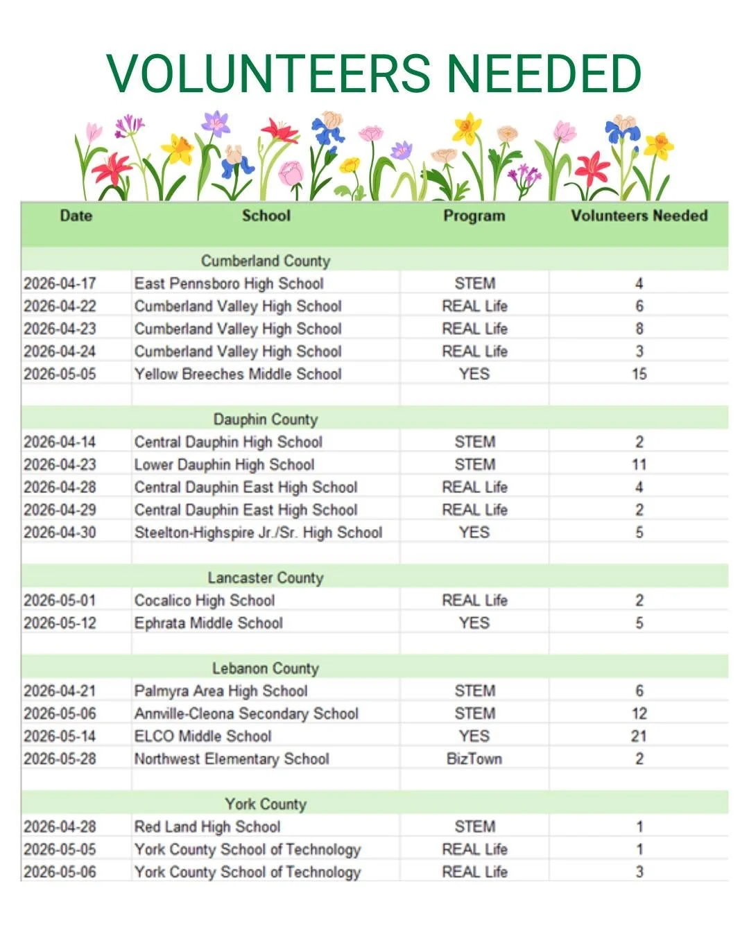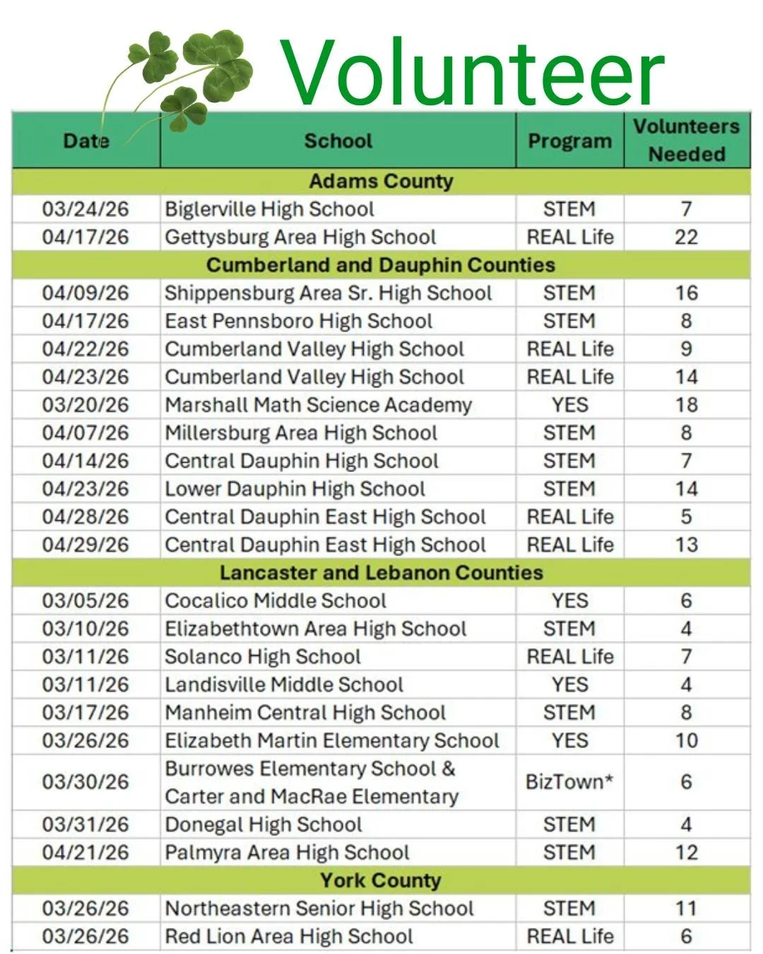 volunteer-led programs free of charge to schools/students.